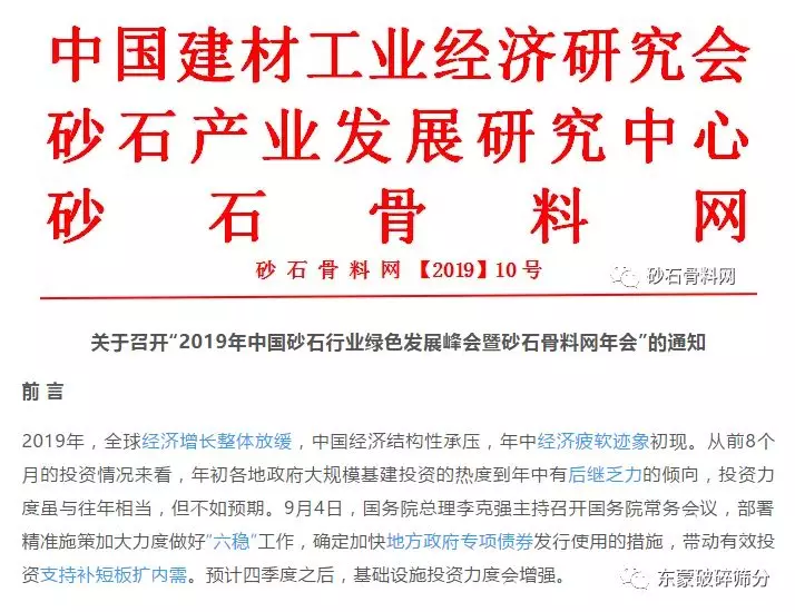 2019年,全球經(jīng)濟(jì)增長(zhǎng)整體放緩,中國(guó)經(jīng)濟(jì)結(jié)構(gòu)性承壓,年中經(jīng)濟(jì)疲軟跡象初現(xiàn),預(yù)計(jì)四季度之后,基礎(chǔ)設(shè)施投資力度會(huì)增強(qiáng)。另一方面,在時(shí)代背景下,綠色生態(tài)發(fā)展的主旋律不變,砂石骨料對(duì)基礎(chǔ)建設(shè)的影響也在逐步加深,并引起有關(guān)部門的高度重視。大型砂石骨料項(xiàng)目出讓、投產(chǎn)等消息不絕,央企、國(guó)企和大型建材企業(yè)也在加速進(jìn)入。從河砂、碎石開(kāi)采納入市場(chǎng)準(zhǔn)入負(fù)面清單,到首部資源稅法表決通過(guò),砂石行業(yè)相關(guān)稅費(fèi)制定步伐加快。